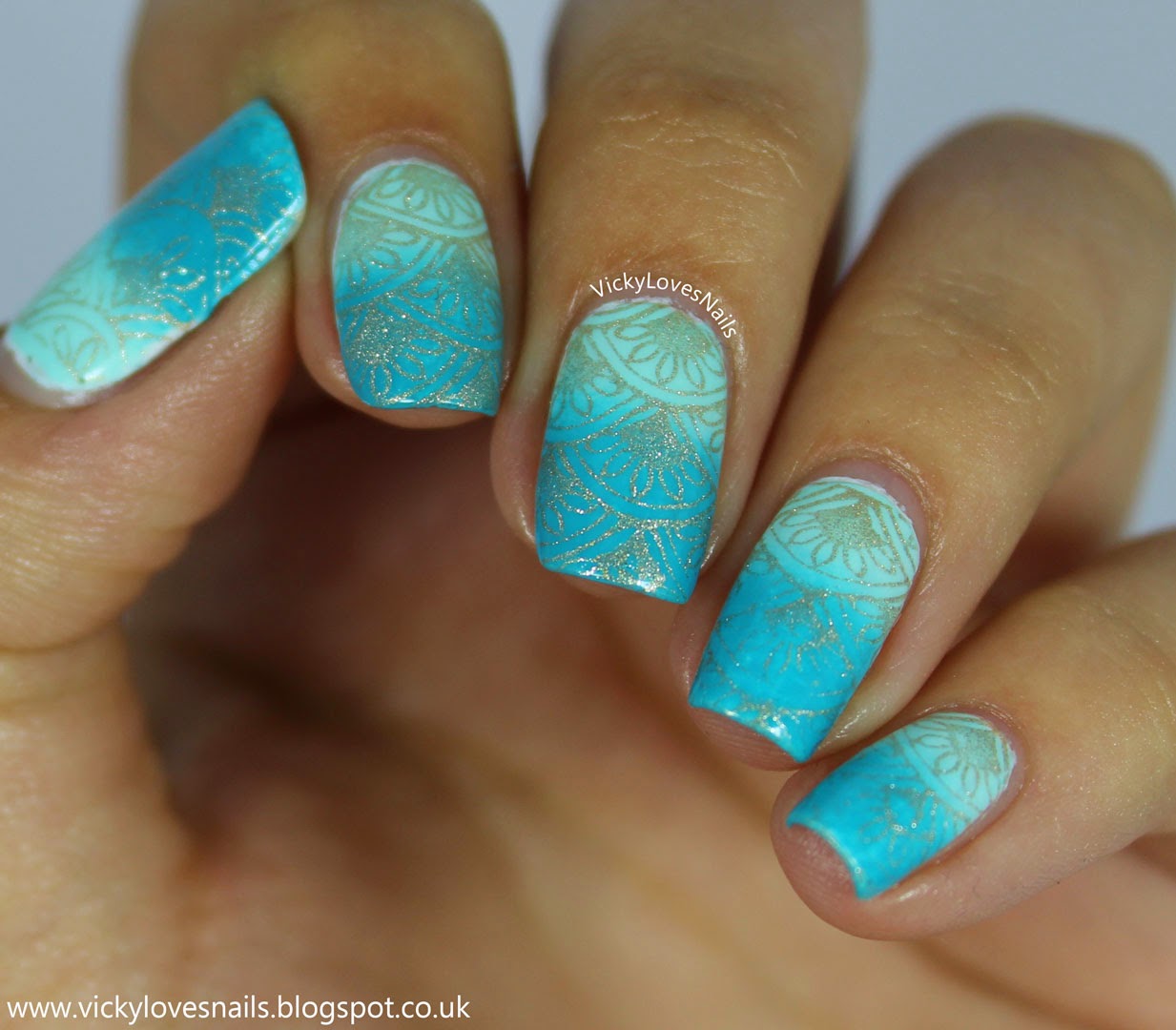 I have the start of a brand new challenge to show you today. I am part of the Crumpet's Nail Tarts group on Facebook and we are starting a brand new weekly challenge for the next year. Each week there will be two themes set to create some nail art with - we can use either one of the themes or both of them combined. I want to try to use both of the themes each week to challenge myself but I will have to see how I go. This week's themes are a two colour gradient and teal, so I've gone for a teal gradient and also added in some stamping.