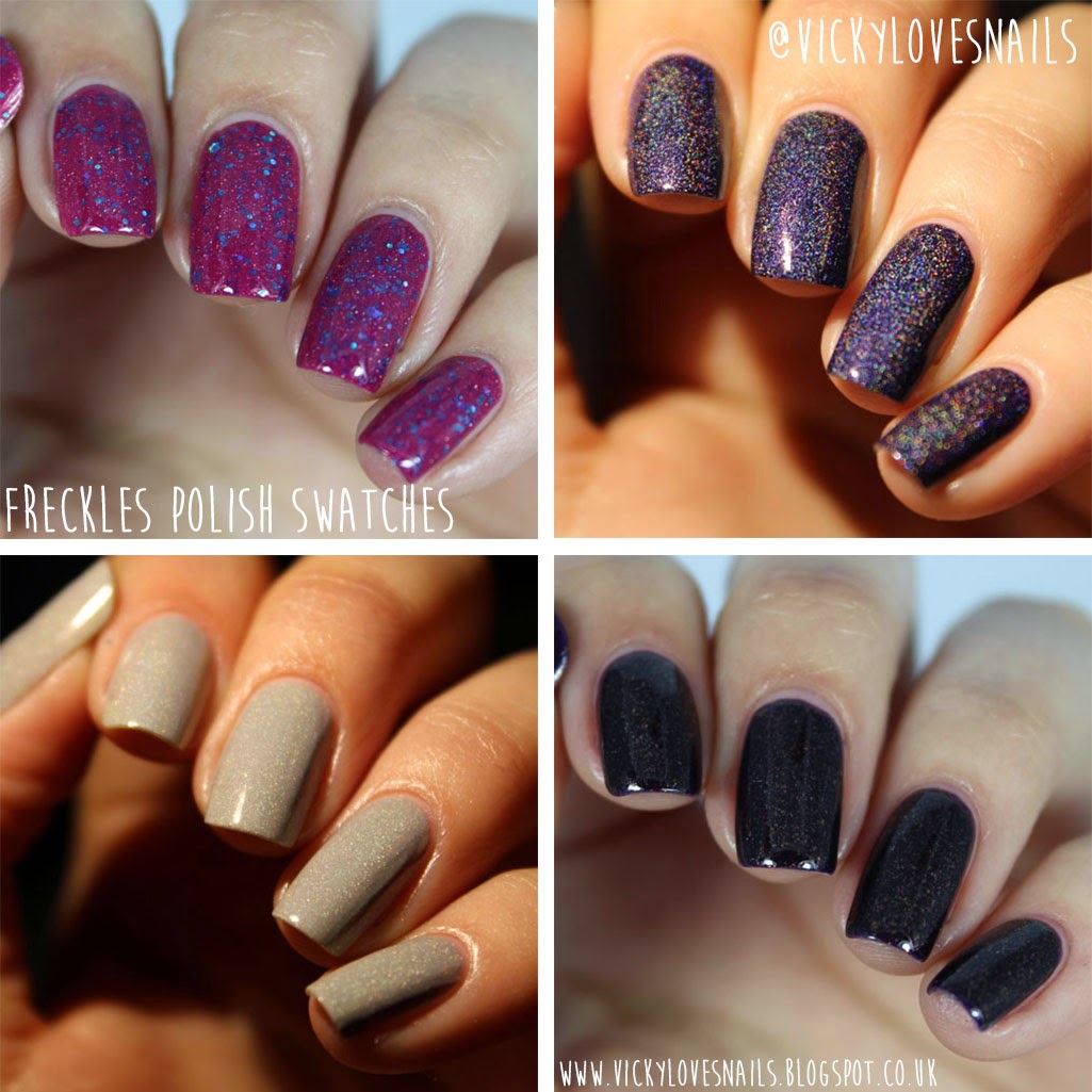 However I did receive four lovely polishes for review from Freckles Polish, including my very own collaboration polish which I am very excited about - so I just had to blog about them. I have two polishes from The Collaboration Collection (including my own) and two polishes from The Birthday Party Collection to show you, which are celebrating one wonderful year of Freckles Polish!